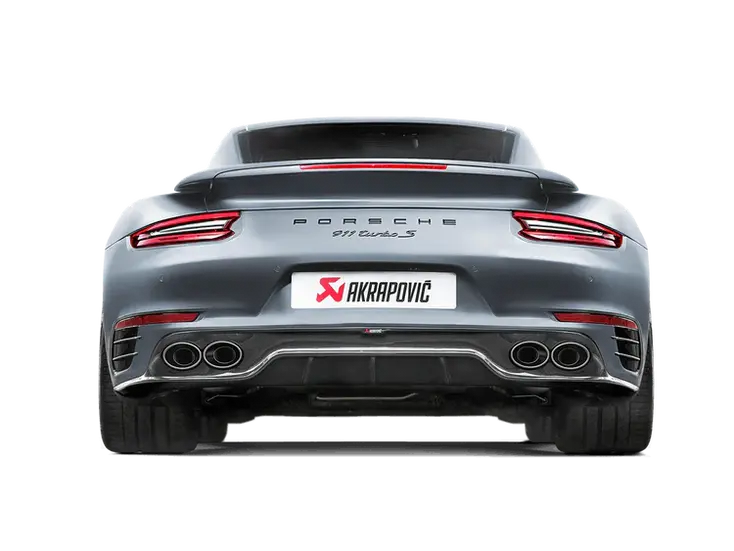 A Porsche Turbo / Turbo S fitted with the Akrapovič exhaust system is further enhanced with the mandatory hand-crafted carbon fiber rear diffuser in matte or high gloss finish , incorporating two sets of side located titanium tailpipes.